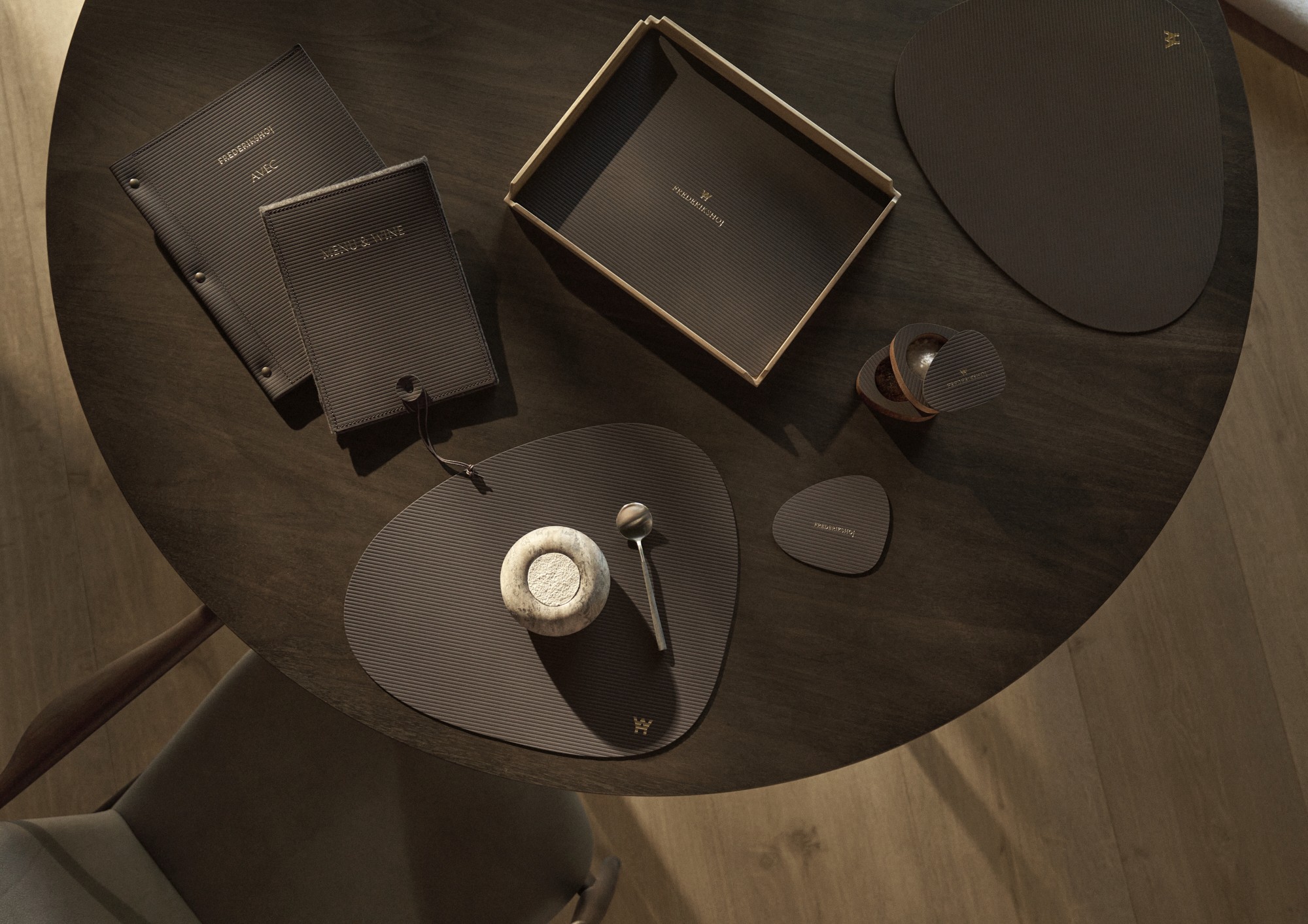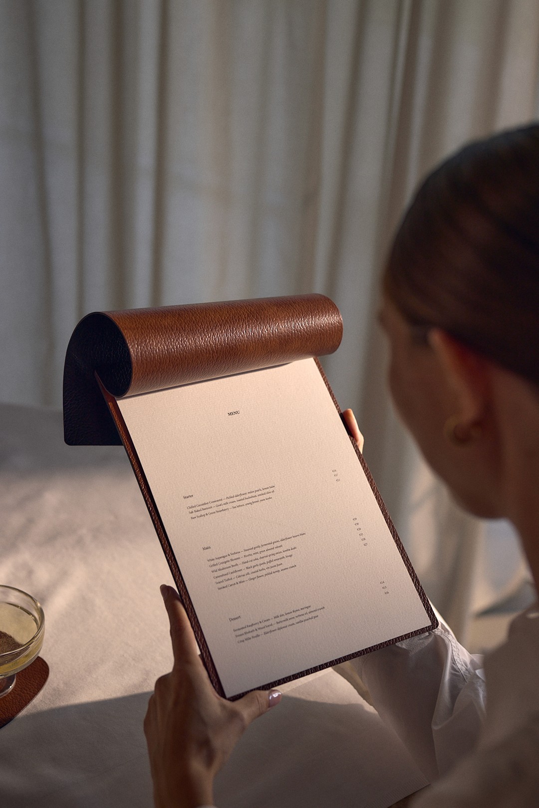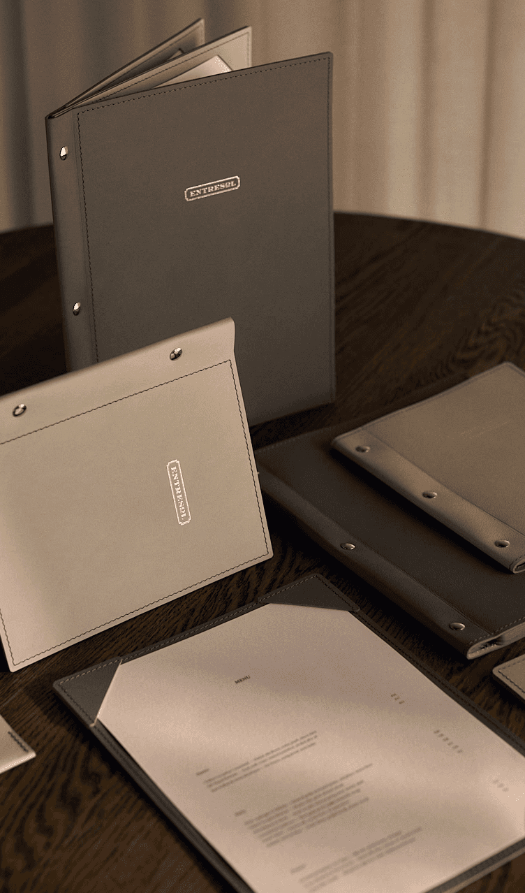 Crafted from our signature recycled leather, LIND DNA Menu and Payment Holders combine Scandinavian design with functionality and durability. Each collection offers a distinct expression—whether with sleek elastic strings for holding multiple pages, refined rivet details for a decorative yet practical closure, or double folders designed to elegantly separate menu and wine list.