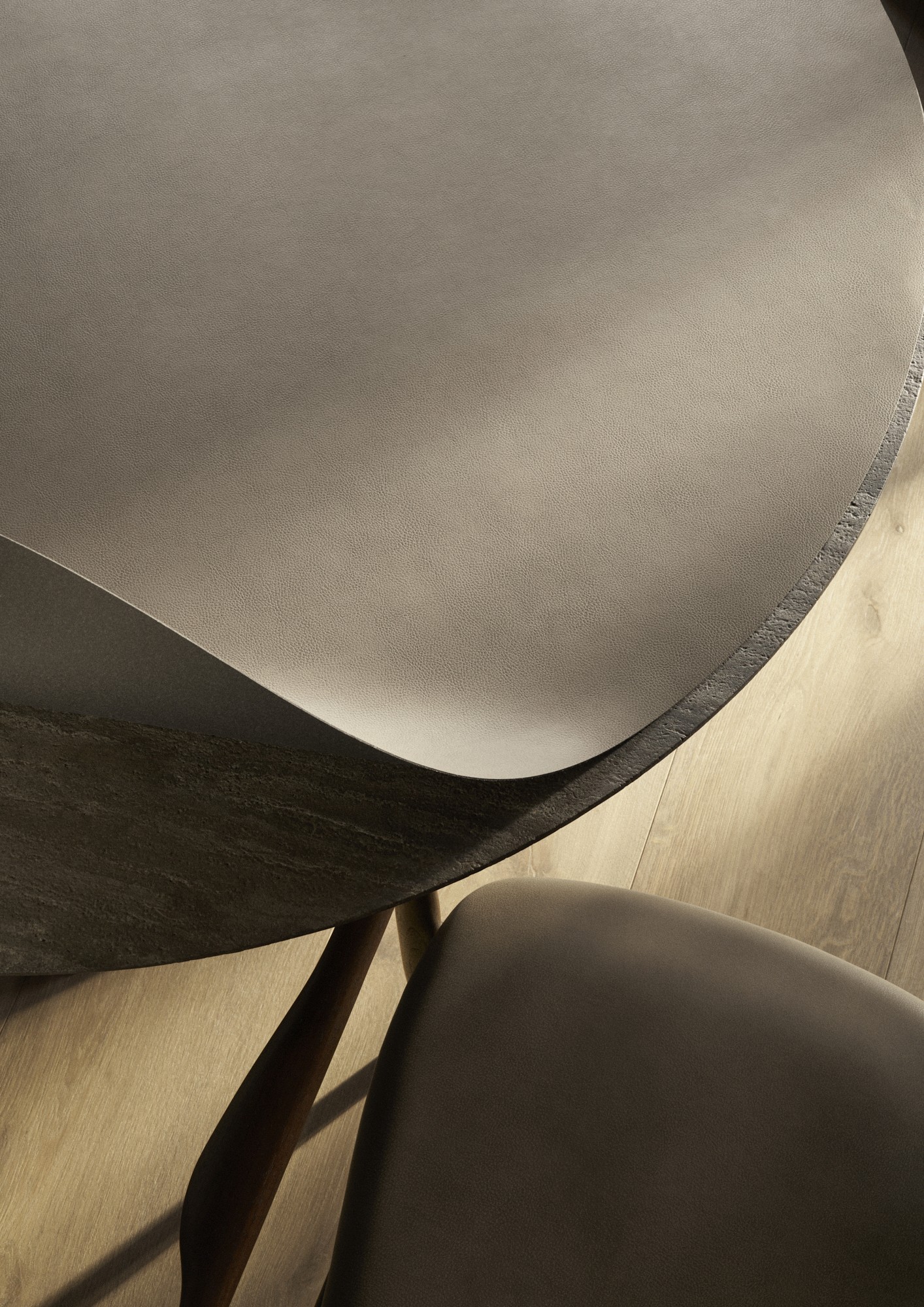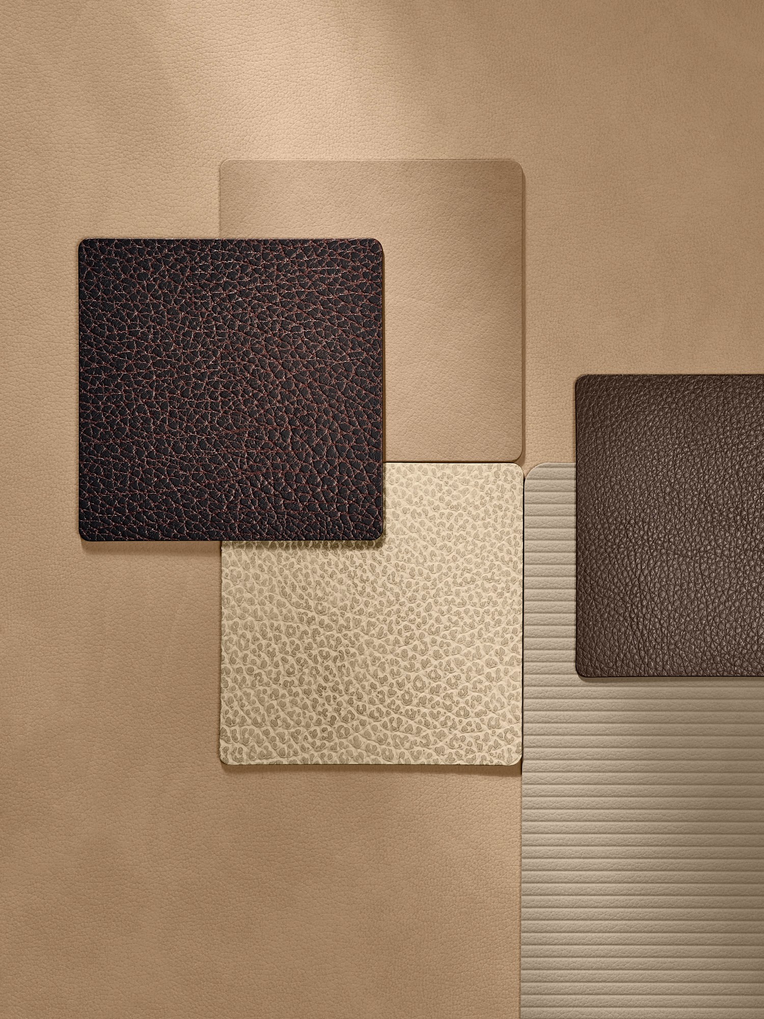 The signature recycled leather of LIND DNA is made from high–quality surplus leather from the furniture and fashion industry. The leftover core leather is finely ground and fused with natural rubber a composition of 80% granulated leather and 20% natural rubber. This natural blend not only gives new life to discarded materials but also makes the leather stronger, more durable, and more resistant than in its original form.